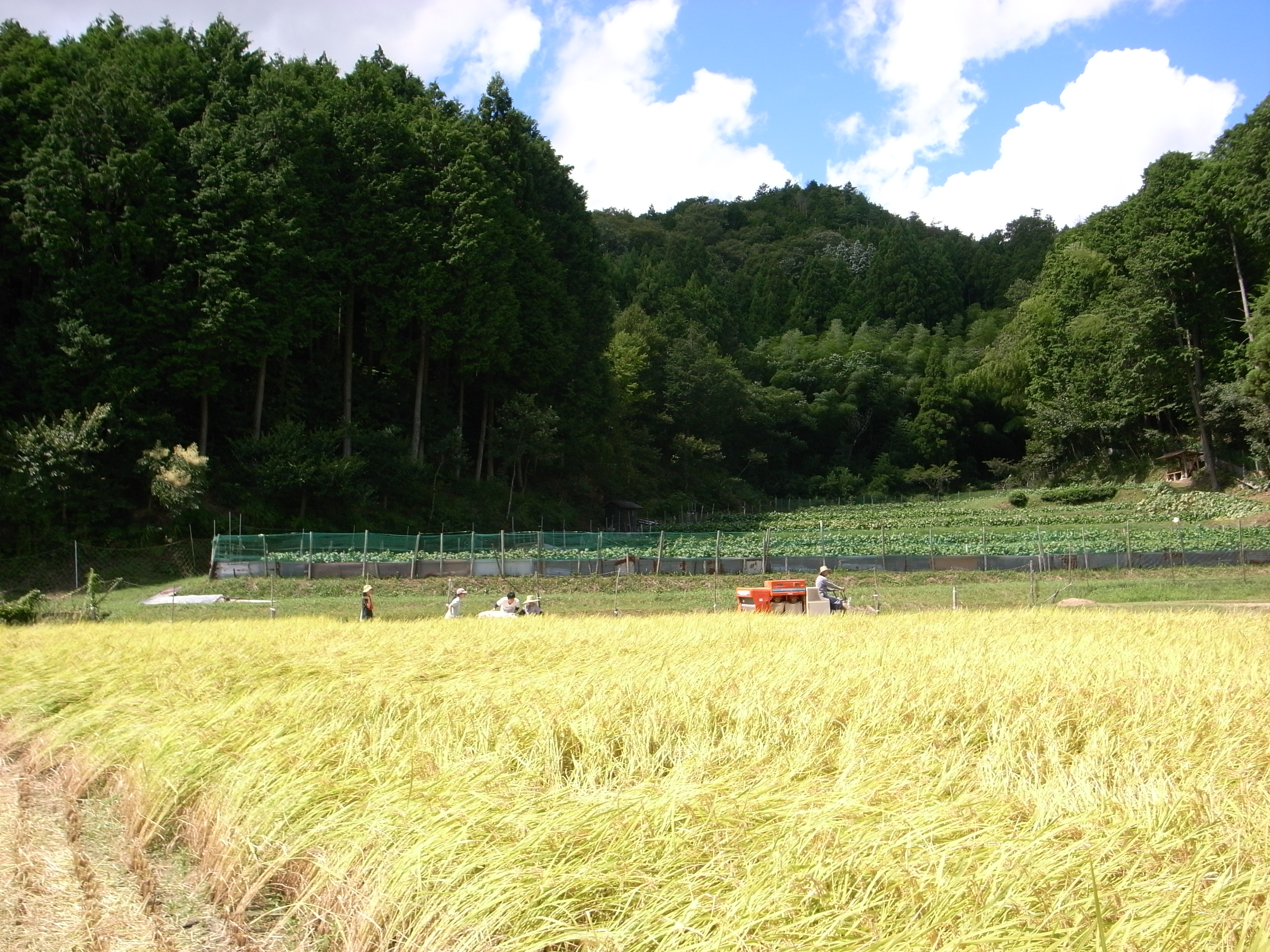 篠山市着地型観光ガイドブック「明日、ささやまいこうかな」冊子の取材中の1コマ。稲刈りを大学生がお手伝い。黄金色の向こうに見える赤いトラクターがかわいらしい。地元の方と大学生が共に作業をしながら稲を刈り取ります。(2011/09/11 撮影:ROOT片平)