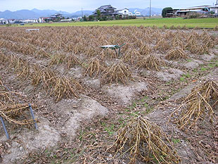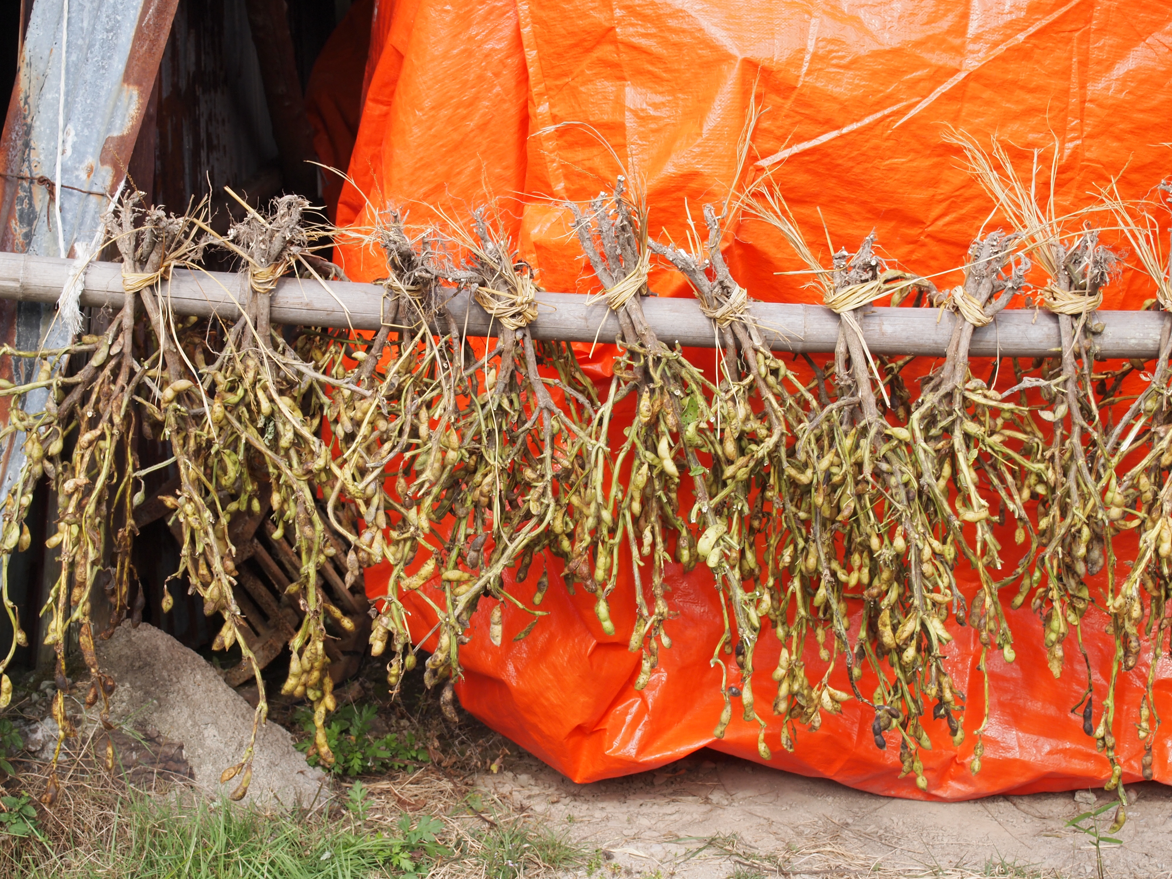 「黒豆サイクリングツアー」の事前調査中の1コマ。刈り取られ、葉をとられた黒豆を枝ごと逆さまにして乾燥&保管中。この後、乾燥機⇒脱穀(お米と同様、黒豆もさやから出すことをこうよびます)を経て、出荷されます。お正月のおせちを彩る黒豆出荷の勝負は12月中旬まで。(2011/11/18 撮影:ROOT片平)