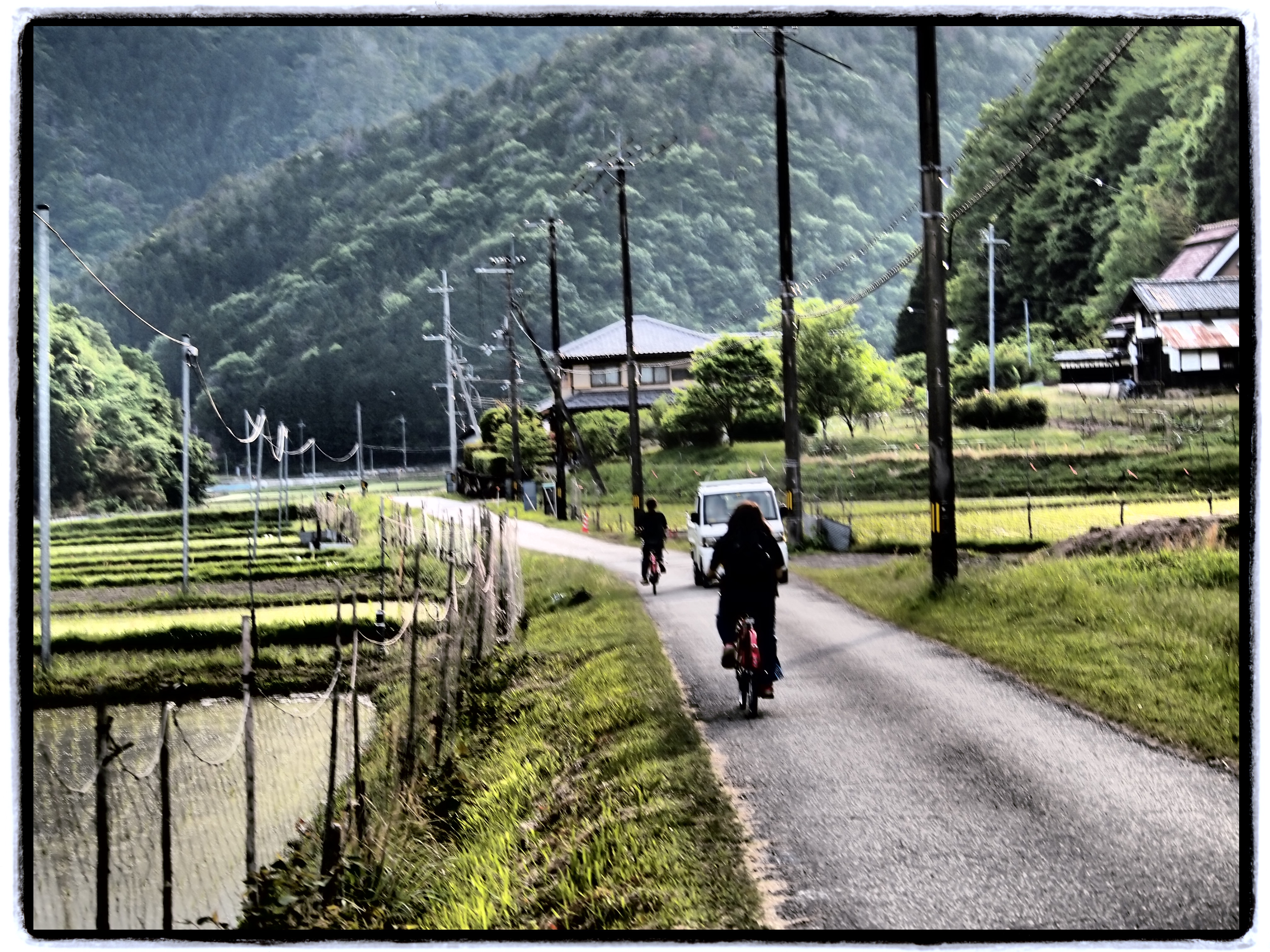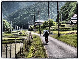 集落丸山からお城へ向けて-。なだらかな下り坂が続くこの道。地元の方曰く「高校生の時は(お城近くの)高校まで、一度も自転車をこがずに行けるか、何度も試したよ」。山の間をさっそうと走り抜けます。