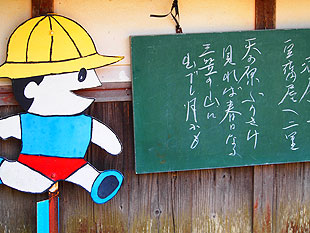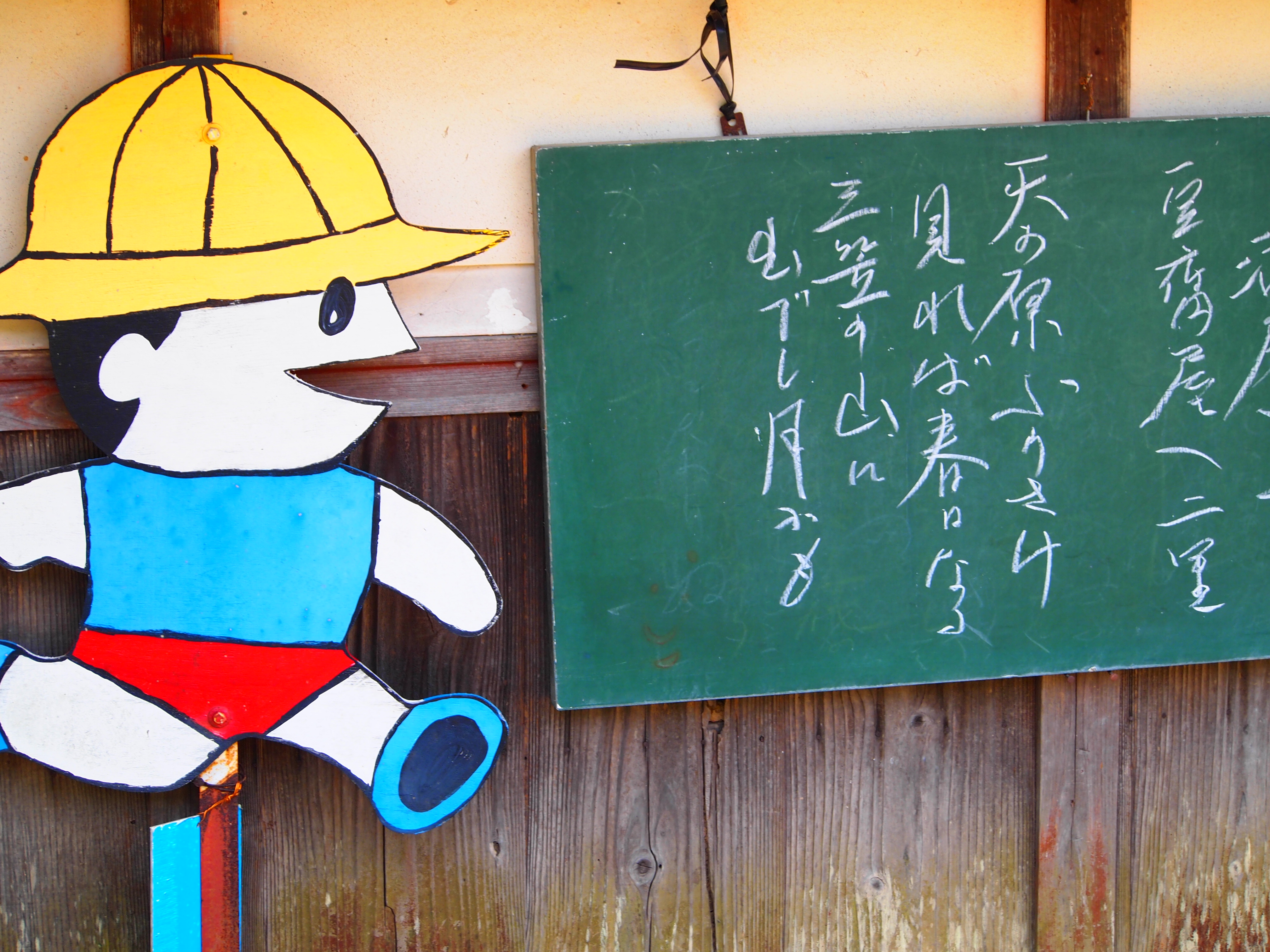 丸山集落のマスコット「飛び出しぼうや」と、毎日毎日書き換えられる「村の伝言板」。