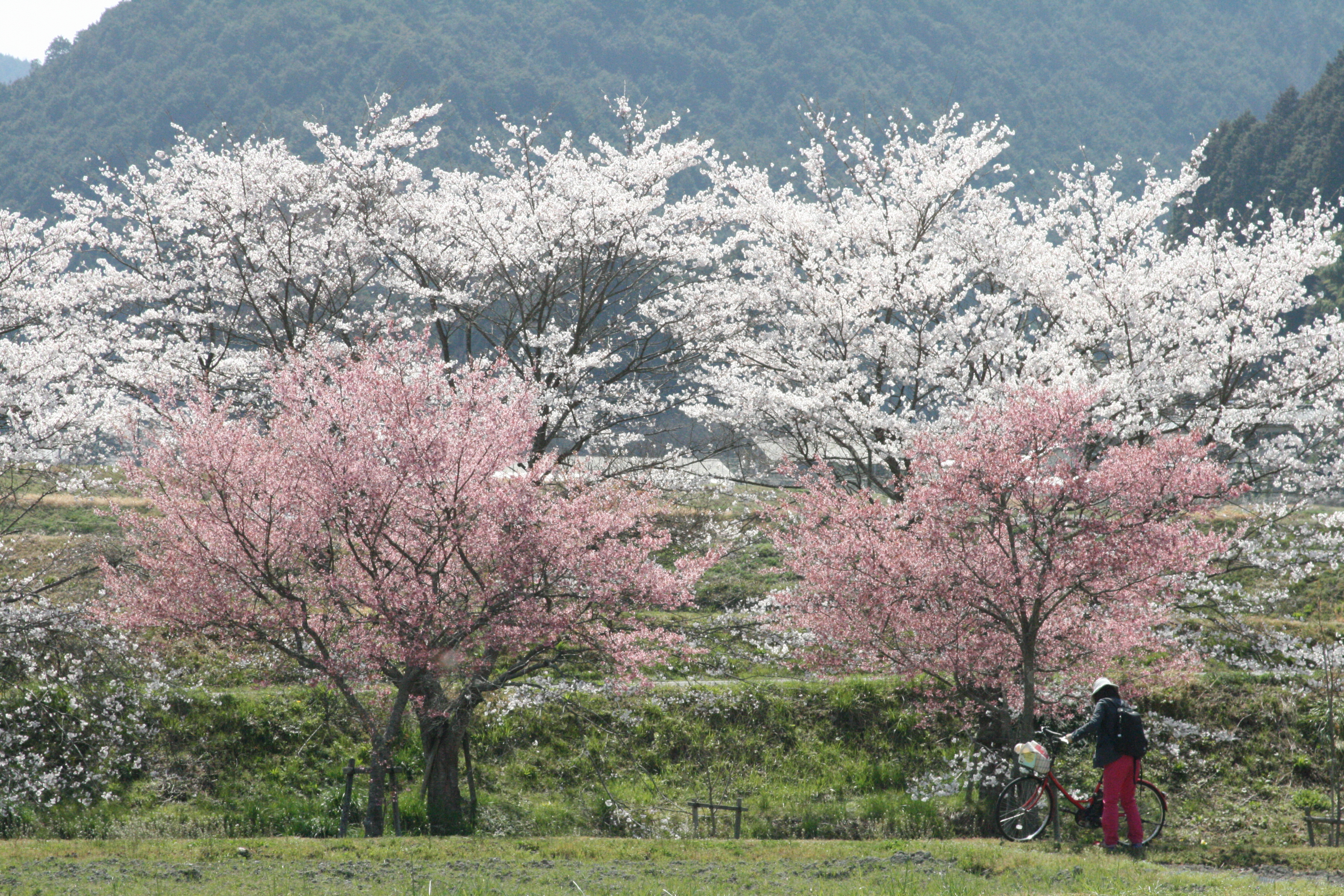 大山集落の大山川沿いに立ち並ぶ桜並木の様子。濃いピンクの「オカメザクラ」(手前)と、薄墨色の「ソメイヨシノ」(奥)が、川の両脇にびっしりと。車の入れないような河原へも、散歩やサイクリングでお花見できます。一見の価値ありです。