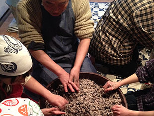 福住で実施された「黒豆味噌づくりワークショップ」の1コマ。やわらかくなった黒豆を参加者の方、地元の方が一緒になって手でつぶしていきます。ここで仕込んだお味噌は自宅へ持ち帰り、約半年をかけてじっくり発酵。出来上がりはその年の秋ごろです。(2012/02/18 撮影:ROOT谷垣)
