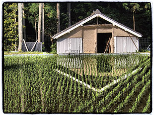 三嶽山登山後に下った集落(奥畑)での1コマ。水を張った田に伸び つつある稲、土づくりの道具小屋-。田に映りこんだその姿が印象的でした。(2011/05/25 撮影:ROOT片平)