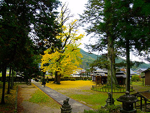大山宮集落にある追手神社。樹齢約350年の「夫婦いちょう」が今年も豪奢に色づきました。右には国内最大級のモミの本種、通称「千年モミ」がそびえます。大木のエネルギーを全身で感じられるスポットです。
