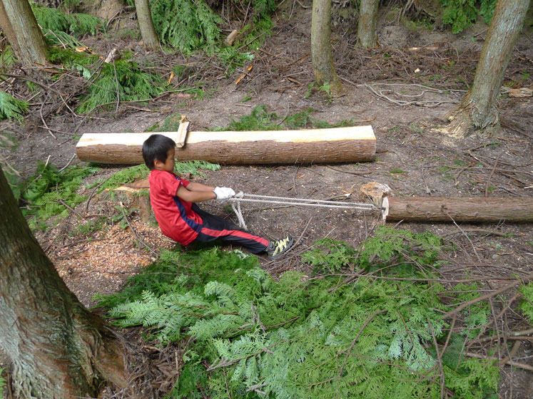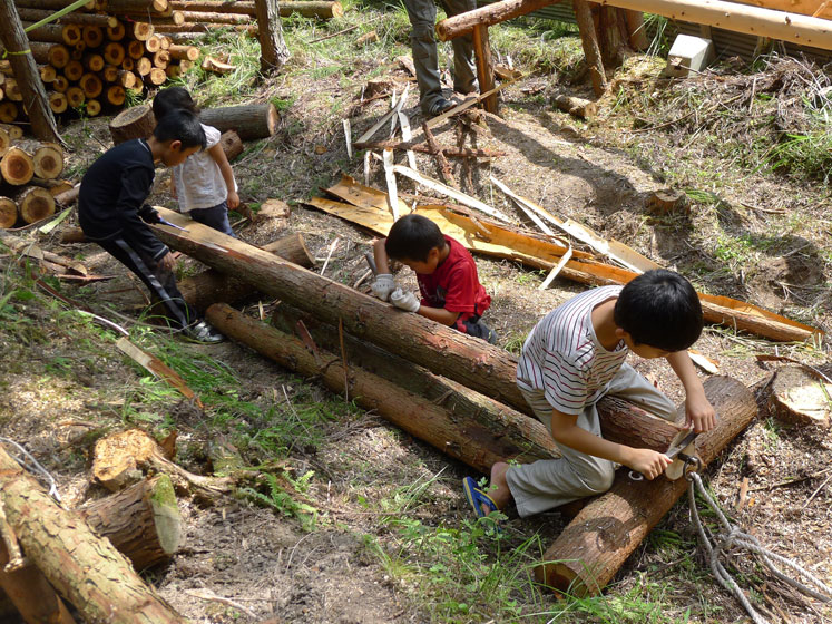 山に育つ一本の木から何ができるだろう。一本の立ち木がどんなプロセスを経て材となり、生活に役立つあらゆるものに変化するのかを丁寧に追っていきます。まずは切るところから、切り倒した木を材に仕上げていきます。途中、川遊びも楽しみながら、里山ですごす一昔前の夏休み。自然と繋がる濃い一日。