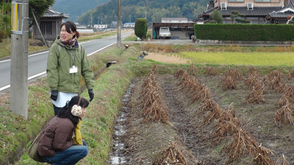 師走の時期、黒豆の出荷に追われる篠山の地をサイクリング。黒豆畑で黒豆が乾燥されている様子、そして集落営農の組合が運営する脱穀場など通常は触れることのできない「普段着の黒豆」を学ぶことができる研修型サイクリングツアーです。軒先や畑で作業する方々に声をかけ、臨時でガイドをお願いすることも-道端に立ち止まっての地域の方々とのふれあいも魅力です。見学後は地元の方提供の黒豆づくりランチ付き。2012年も開催予定です。