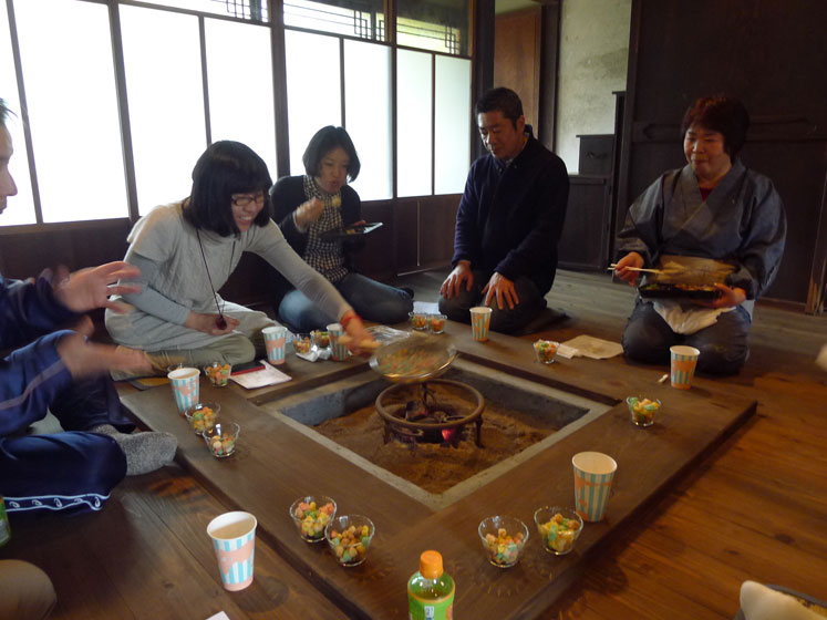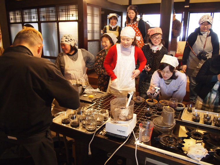 本物の丹波篠山産の黒豆と麹をすり鉢でごりごり。当日は地元の方の指導の元、昔ながらの技法で味噌をつくり、自宅に持ち帰ることができます。冬に仕込んだお味噌は冷蔵庫で寝かせて、秋に食べごろを迎えます。会場の福住集落は、格子戸や土間の佇まいを残す旧宿場町。京都から篠山城下町をつなぐ旧街道を「ぶらぶら町並み散歩」もオススメです。